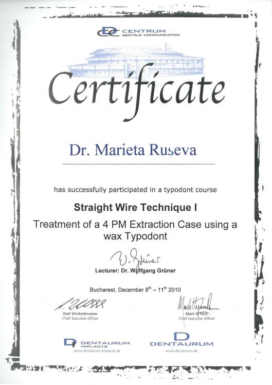 За ортодонт Русева Д-р Мариета Русева завършва висшето си образование по дентална медицина в Университета по медицина и фармация “Карол Давила“-гр. Букурещ, Румъния през 2008г.. През 2012г. придобива специалност по Ортодонтия и Лицево-челюстна Ортопедия към катедрата по „Ортодонтия и Лицево-челюстна Ортопедия“ в гр. Букурещ. През 2016г. преминава практическите курсове по дисциплината “Алекзандър“ при д-р Иван Горялов.
